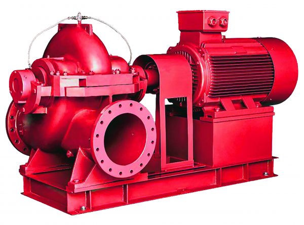 A horizontal split case pump is a unique type of Centrifugal Pump whose casing is divided into two distinct chambers, which is different from end suction pumps that are assembled with the suction nozzle, discharge nozzle and casing in one chamber. FIREGUARD offers FGSF series state-of-the-art Split Case Pumps with Diesel Engine or Electric Motor driven pumps FIREGUARD PUMPS are engineered with fully enclosed double suction impellers. Minimal axial thrust due to double entry impeller. In-line axially split design which permits removed of the complete rotor without removing the pipe and driver. Split Case Pumps are better when the water source is located above ground providing a positive suction FIREGUARD PUMPS are typically used in fire fighting applications for supplying water to the fire hose reels, fire hydrants or sprinkler systems. FIREGUARD PUMPS have a FLOW ranges from 300 to 8000 US GPM and Pressure ratings from 80 PSI up to 300 PSI